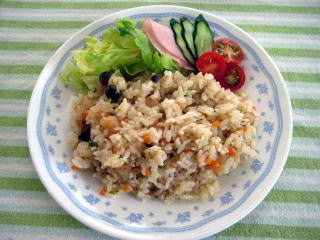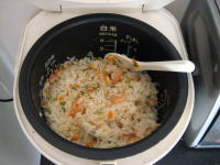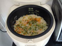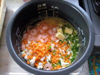 野菜、むきえび、コンソメ2個、バター20グラム、 塩こしょう少々して、炊飯します。 |