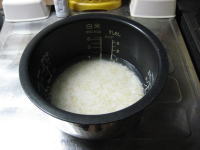 米を洗って、吸水させます。 水の量は、普段より約大さじ3少ないです。 |